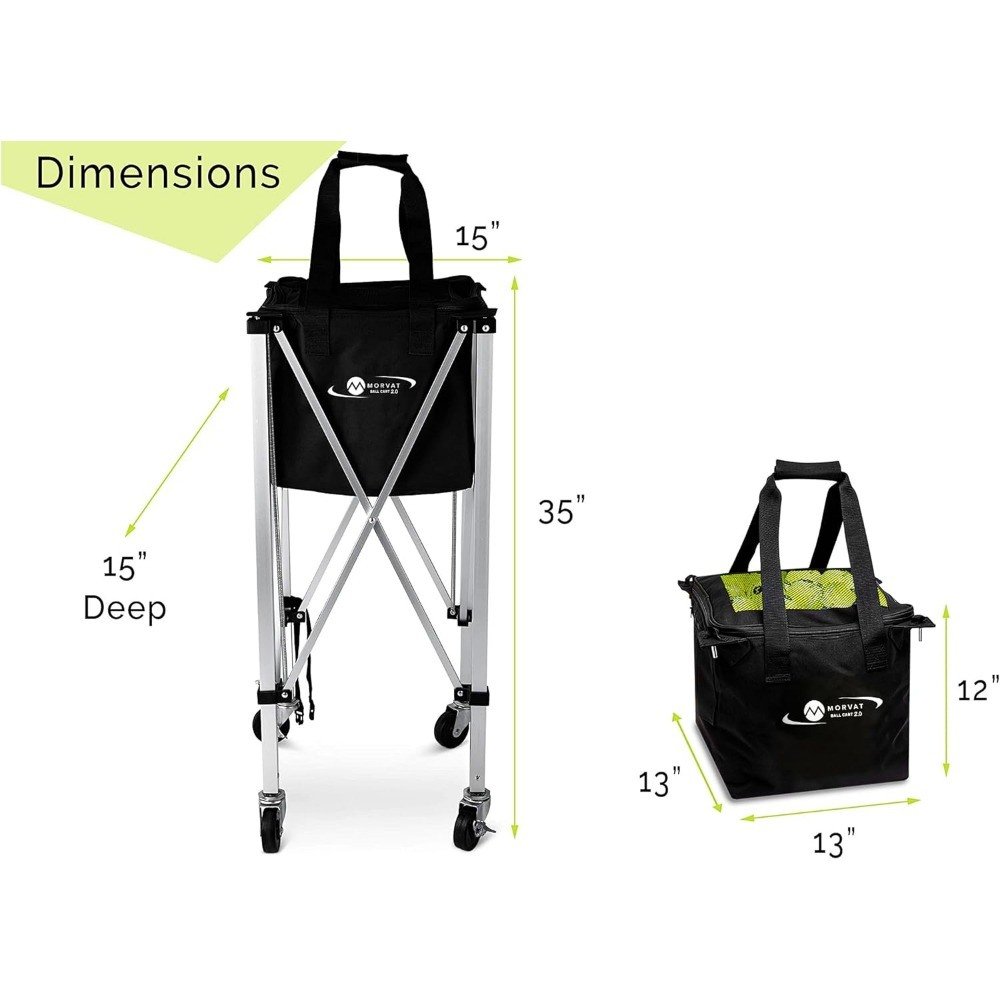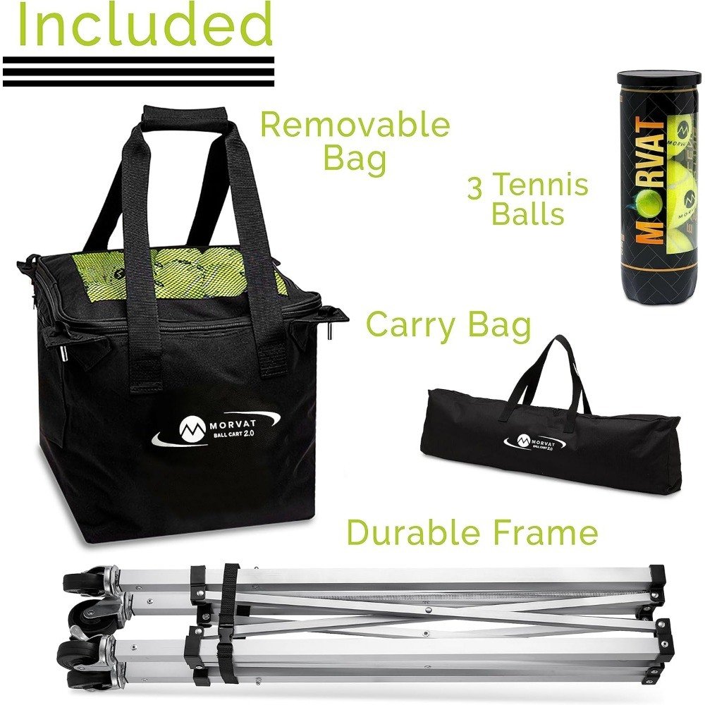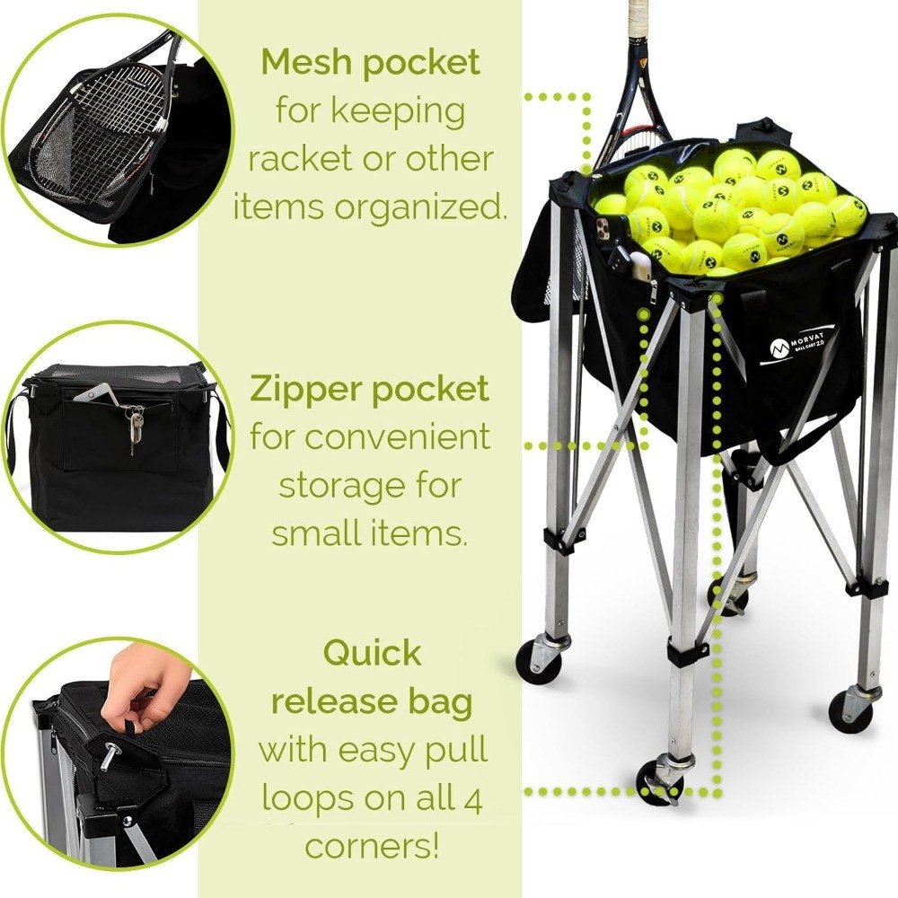 • MORVAT BALL CART 2.0- Optimize your tennis & pickleball training session with included wheels & brake locks. Includes an added zipper pocket for cell phone & keys storage during use. The bag insert is detachable with added finger handles for easy removal & easy to securely snap back into place metal pins.
