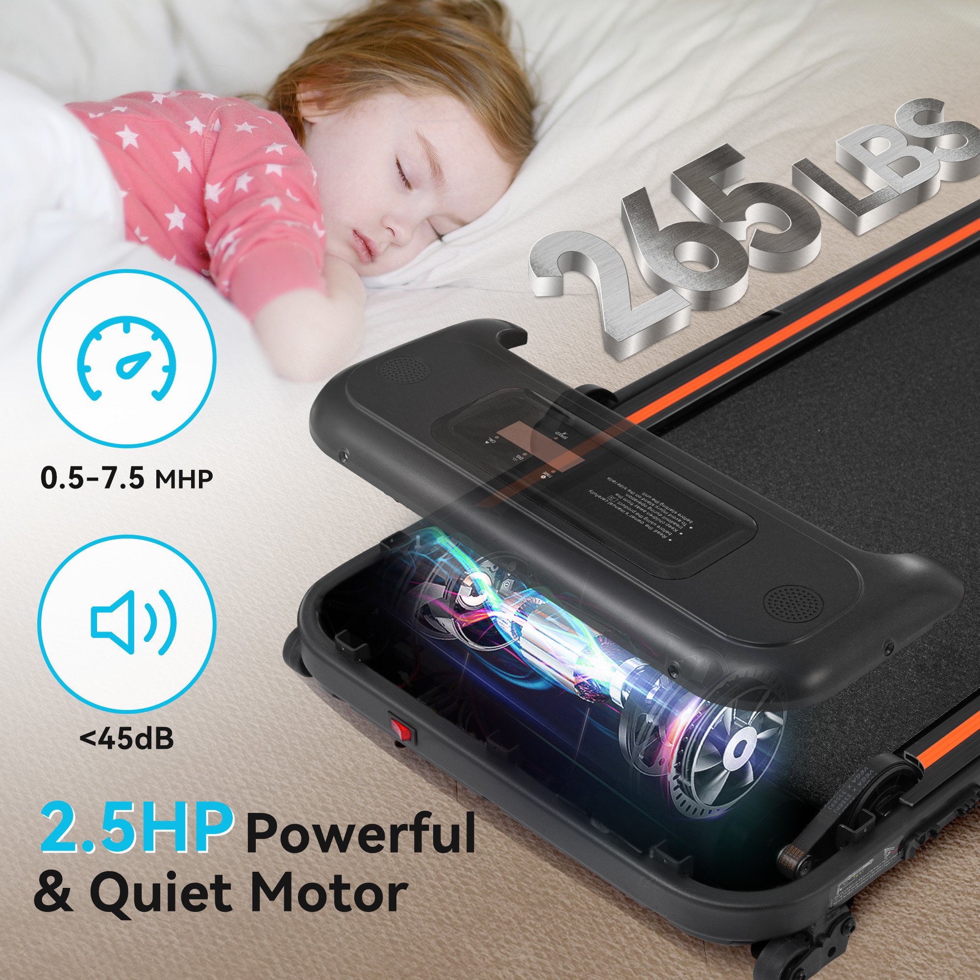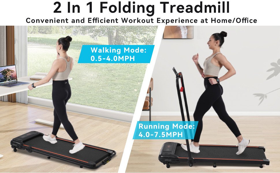 INNOVATIVE 2-IN-1 FOLDING TREADMILL -- Compared to ordinary treadmills, our 2-in-1 treadmill has 2 modes to meet your different sports needs. When the riser is folded, it can be used as a jogging machine at a speed of 0.5MPH-4MPH, when the handrail is raised, the running speed is 4MPH-7.5MPH.POWERFUL 2.5HP -- With a powerful and ultra-quiet 2.5HP motor and load a max weight capacity of 265lbs, this treadmill allows you to walk or run without disturbing others, making it ideal for home and office use. With a sturdy and durable steel frame and multi-layer shield design, it's shock-absorbing and noise-reducing, making your running quieter, safer and more comfortable.WITH PHONE HOLDER, REMOTE CONTROL & Armrest CONTROL -- You can also use the phone holder to watch videos or chat with friends. The remote control (BATTERY NOT INCLUDED) is convenient to adjust the speed of movement and stop instantly. NO INSTALLATION -- No need to install, just take this walking pad out and use it. The dimension of the electric treadmill is 50.2"*24.8"*4.72". With transport wheels, you can easily move and store it under a sofa, bed, or behind a door, which greatly frees up some floor space.FITNESS TRACKING DISPLAY -- Our portable Treadmill is designed with a LED display to show speed, distance, time, and calories burned, allowing you to visualize your exercise and maintain motivation. You can control the speed or stop the treadmill by pressing the remote control.PROTECT YOUR KNEES -- 5 layer anti-slip belt of this desk treadmill is designed to absorb the force of your step, to protect your joints and ligaments from damage.NEW DESIGN WITH INCLINE--New Treadmill With One Second Incline Adjustment. Burn fat more effectively