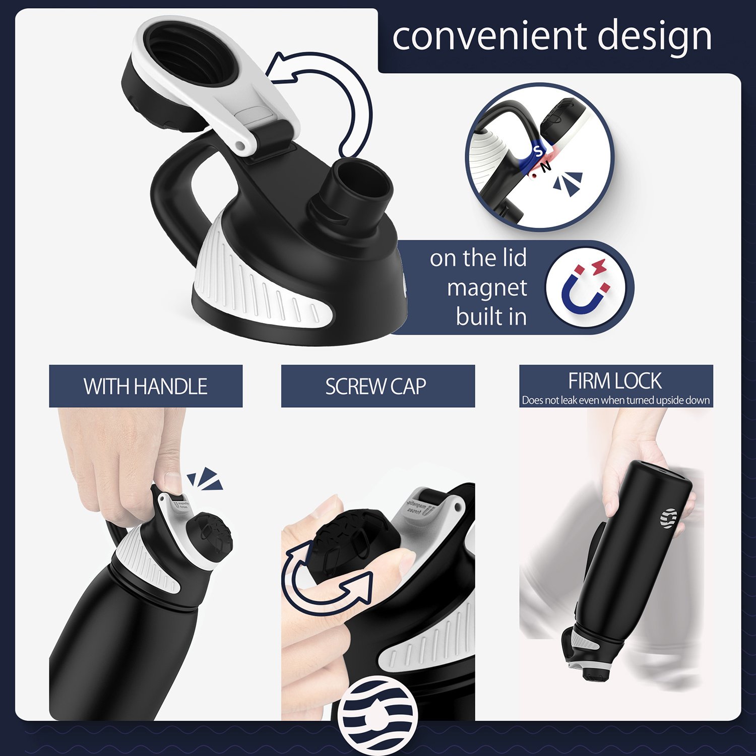 2.Smart Design of the lids - Ergonomic design of the lids makes it flow smoothly. Magnetic force lids will not fall back when drinking water.
