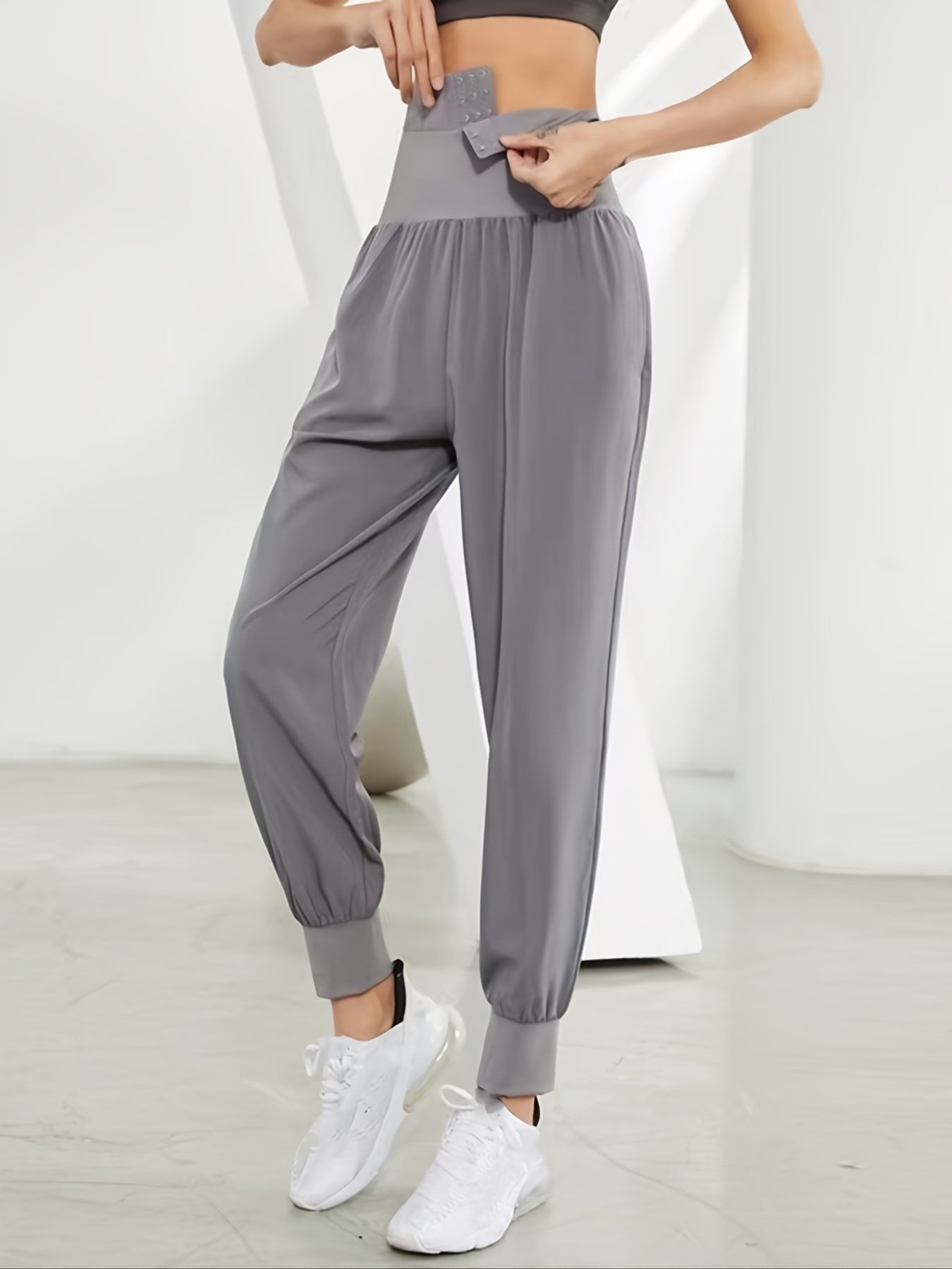 Home > Solid Color High Waist Yoga Fitness Cropped Pants, Breasted Waist Straps Sports Jogging Pants, Women's Activewear