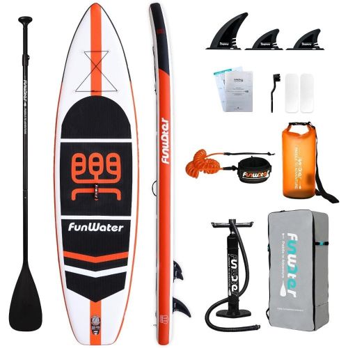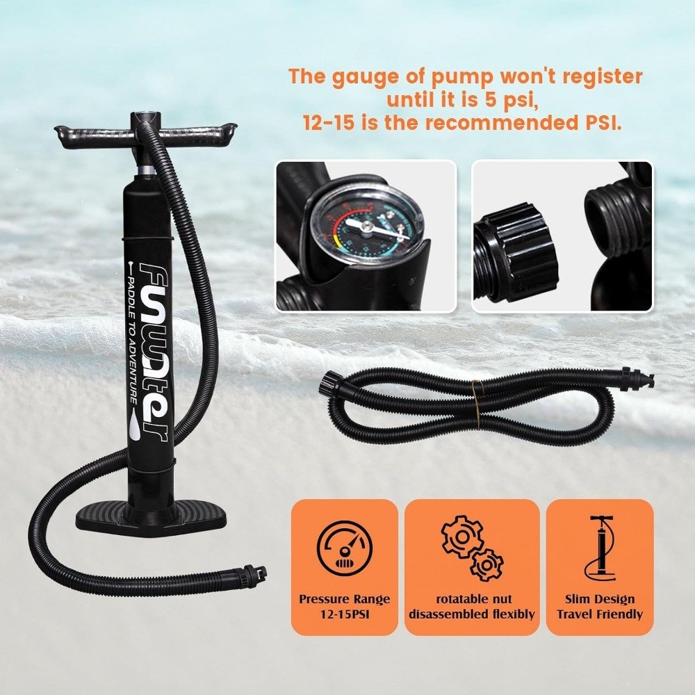 • [Design and Use]Funwater's unique ergonomic handle design allows you to inflate your paddle more easily in a shorter time. The sensitive barometer ensures that you can read the sup inflation pressure value (12-15psi) at any time. The multifunctional elastic string can tightly fix any objects placed on the inflatable paddleboard. The multipurpose and ultra-large backpack can help you easily carry the paddle to any of your dream places.